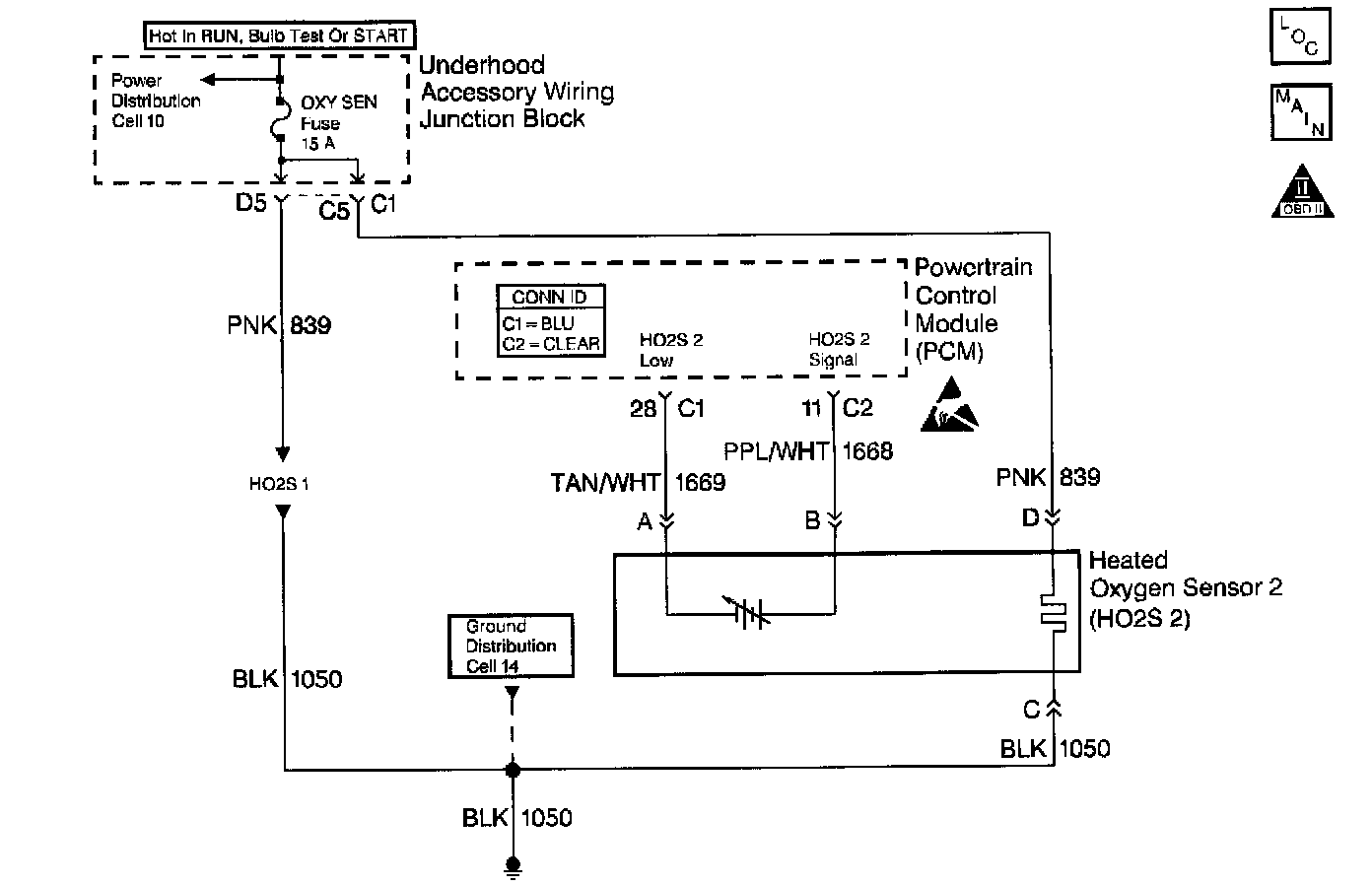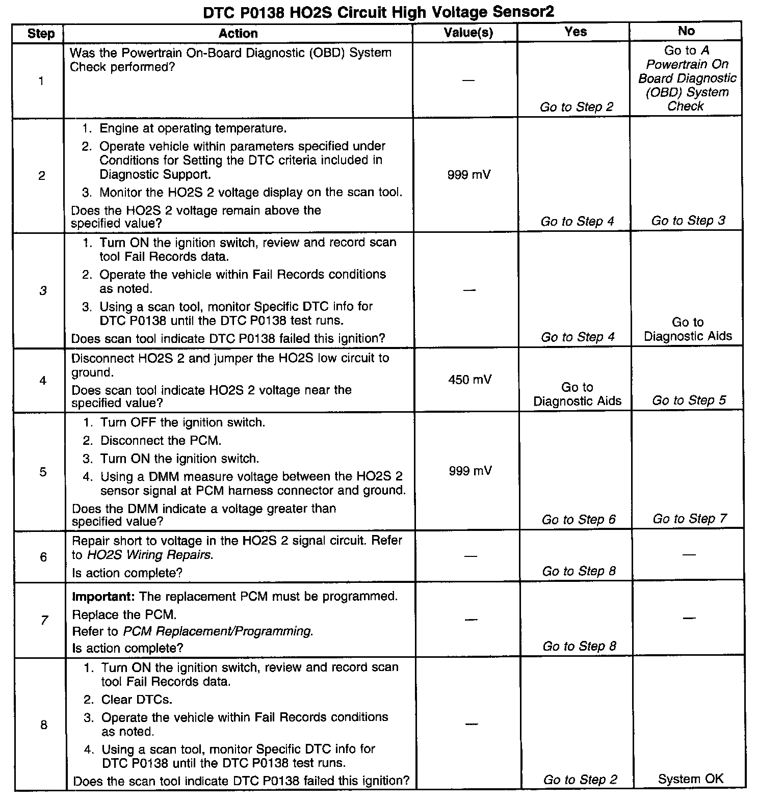 The PCM supplies a bias voltage of about 450 mV between the HO2S signal and low circuits. When measured with a 10 megohm digital voltmeter, this may display as low as 320 mV. The oxygen sensor varies the voltage within a range of about 1000 mV when the exhaust is rich, down through about 10 mV when exhaust is lean. The PCM constantly monitors the HO2S signal during closed loop operation and compensates for a rich or lean condition by decreasing or increasing injector pulse width as necessary. If the HO2S 2 voltage remains excessively high for an extended period of time, DTC P0138 will be set.