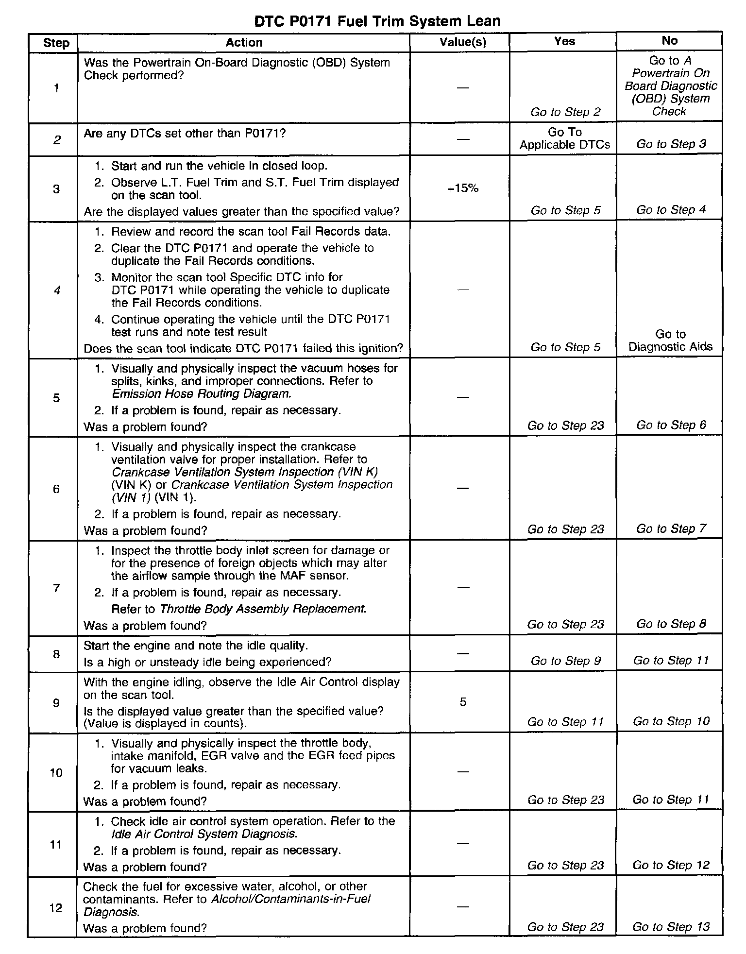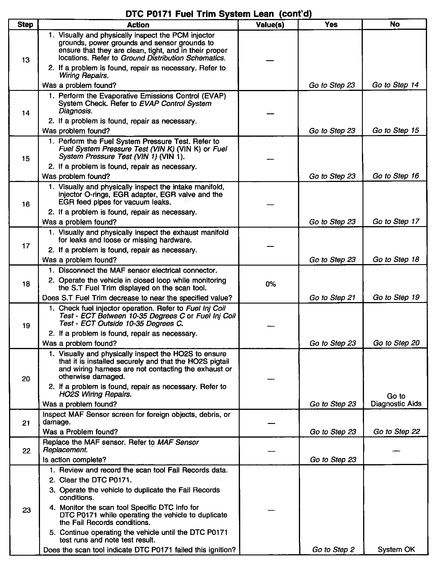2. DTCs other than P0171 may indicate that a condition is present which may cause a lean condition. If this is the case, repairing the condition which caused the other DTC will most likely correct the DTC P0171.