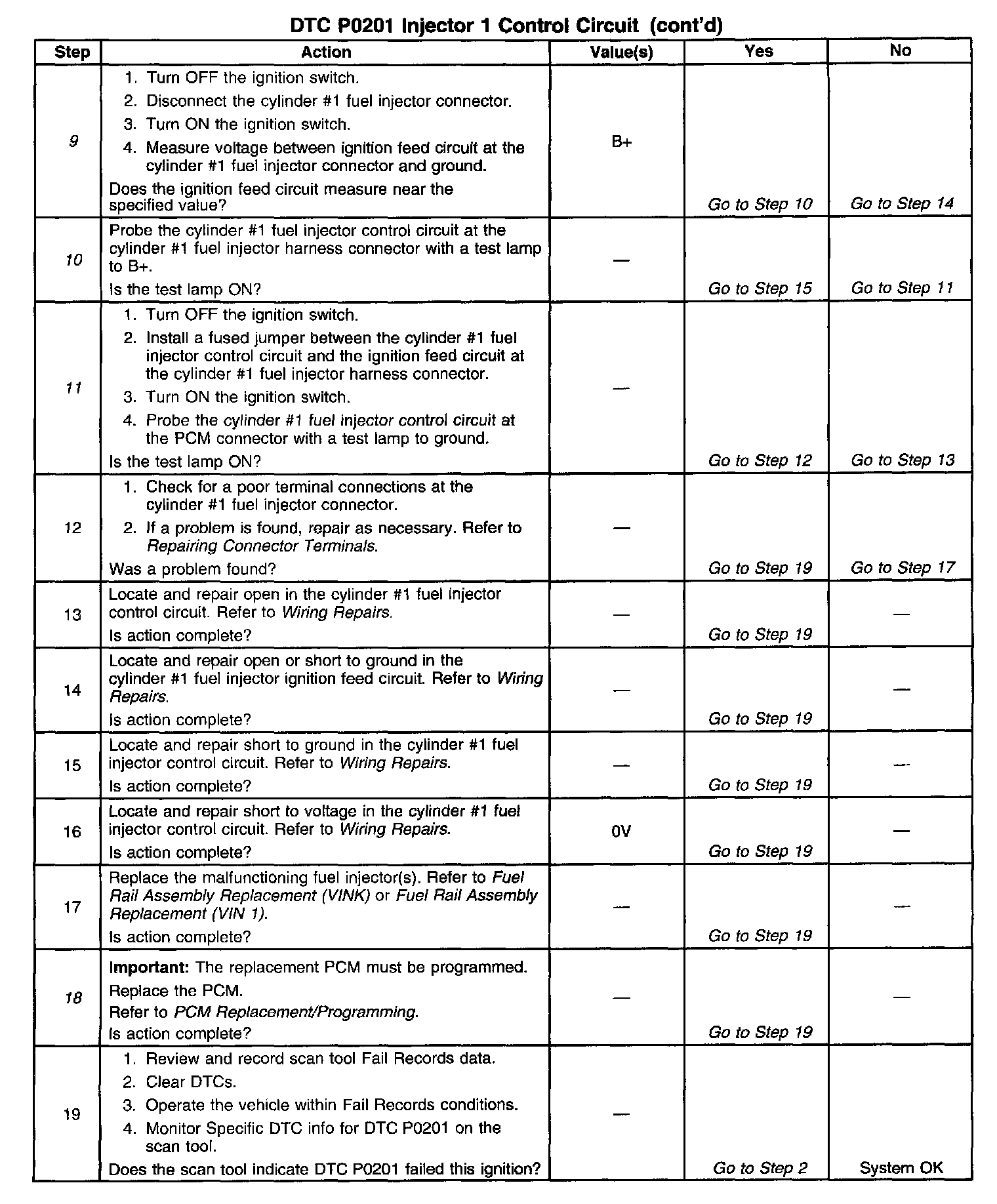 The PCM controls the fuel injectors by using an ignition feed driver and ground circuit within the PCM. The driver has the ability to detect an electrical malfunction in the ignition feed or ground circuit. If an electrical malfunction occurs in the fuel injector circuit for engine cylinder # 1 the ignition feed driver signals the PCM to set DTC P0201.