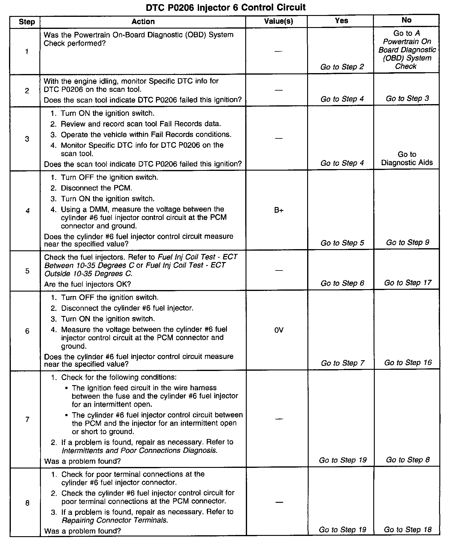 The PCM controls the fuel injectors by using an ignition feed driver and ground circuit within the PCM. The driver has the ability to detect an electrical malfunction in the ignition feed or ground circuit. If an electrical malfunction occurs in the fuel injector circuit for engine cylinder # 6, the ignition feed driver signals the PCM to set DTC P0206.