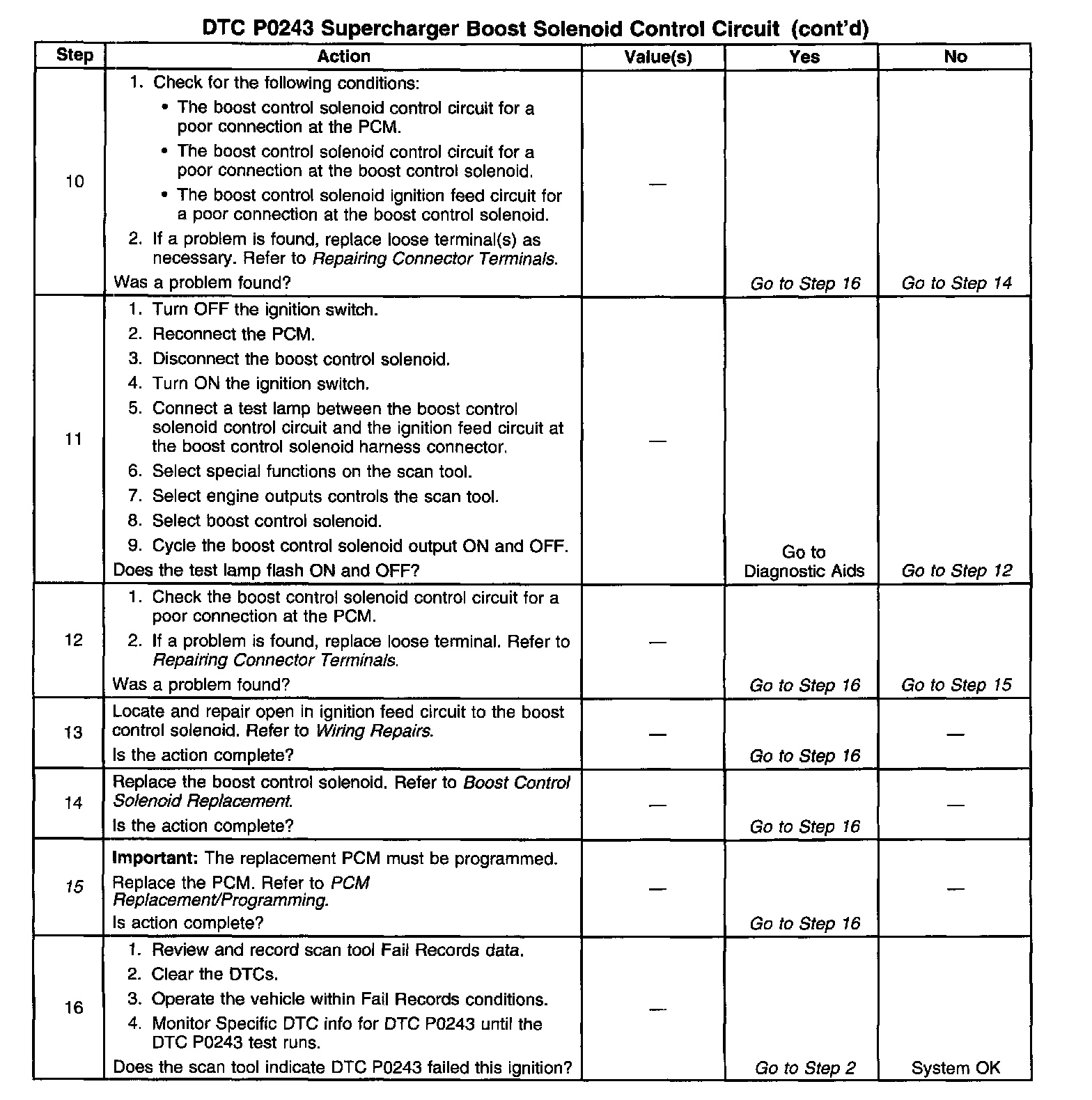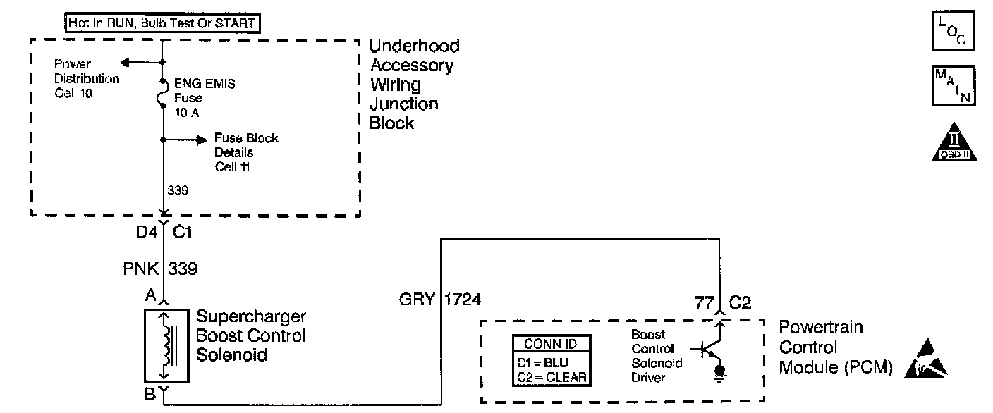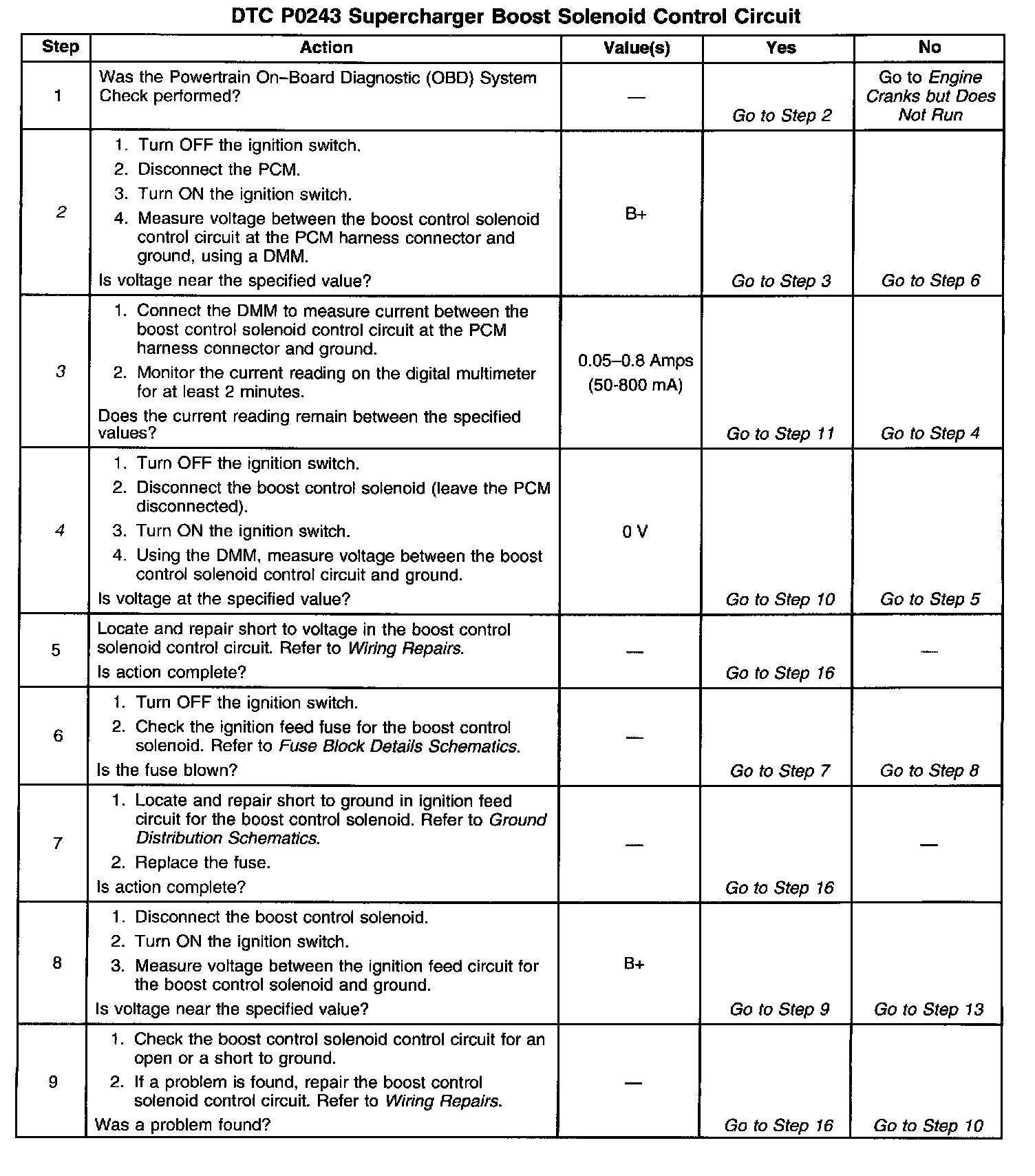 ^ If the harness appears to be OK, disconnect the PCM, turn the ignition ON and observe a voltmeter connected between the boost control solenoid control circuit and ground at the PCM harness connector while moving connectors and wiring harnesses related to the boost control solenoid. A change in voltage will indicate the location of the malfunction.