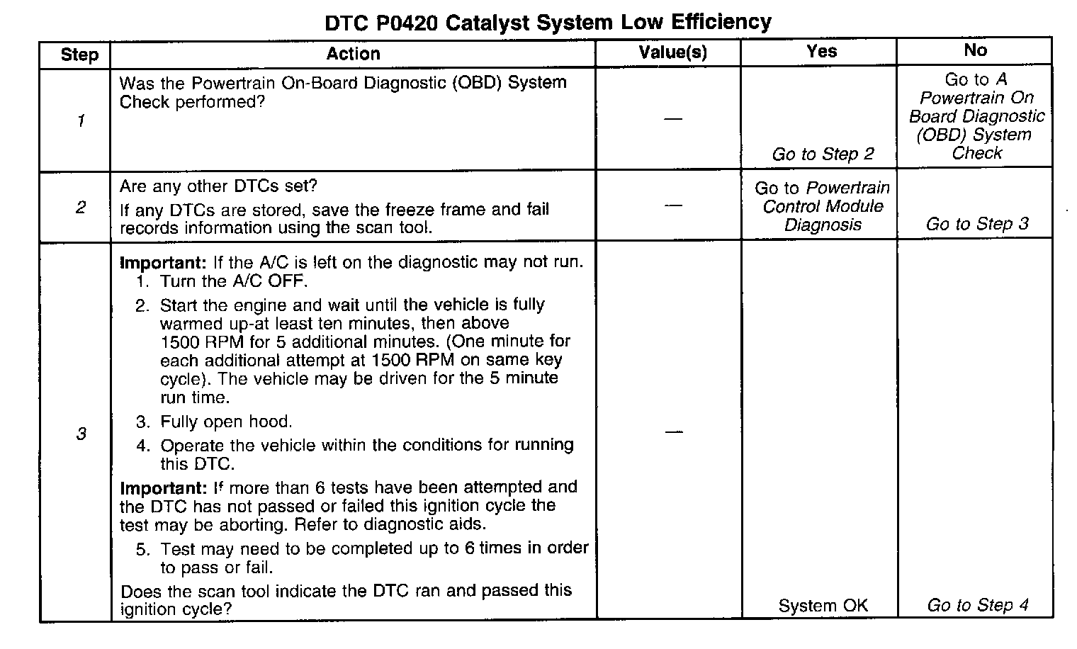 ^ The catalyst test may abort due to a change in engine load (i.e., A/C, coolant fan). If this problem occurs use the scan tool to force the cooling fans on then return to step 3 in the table.