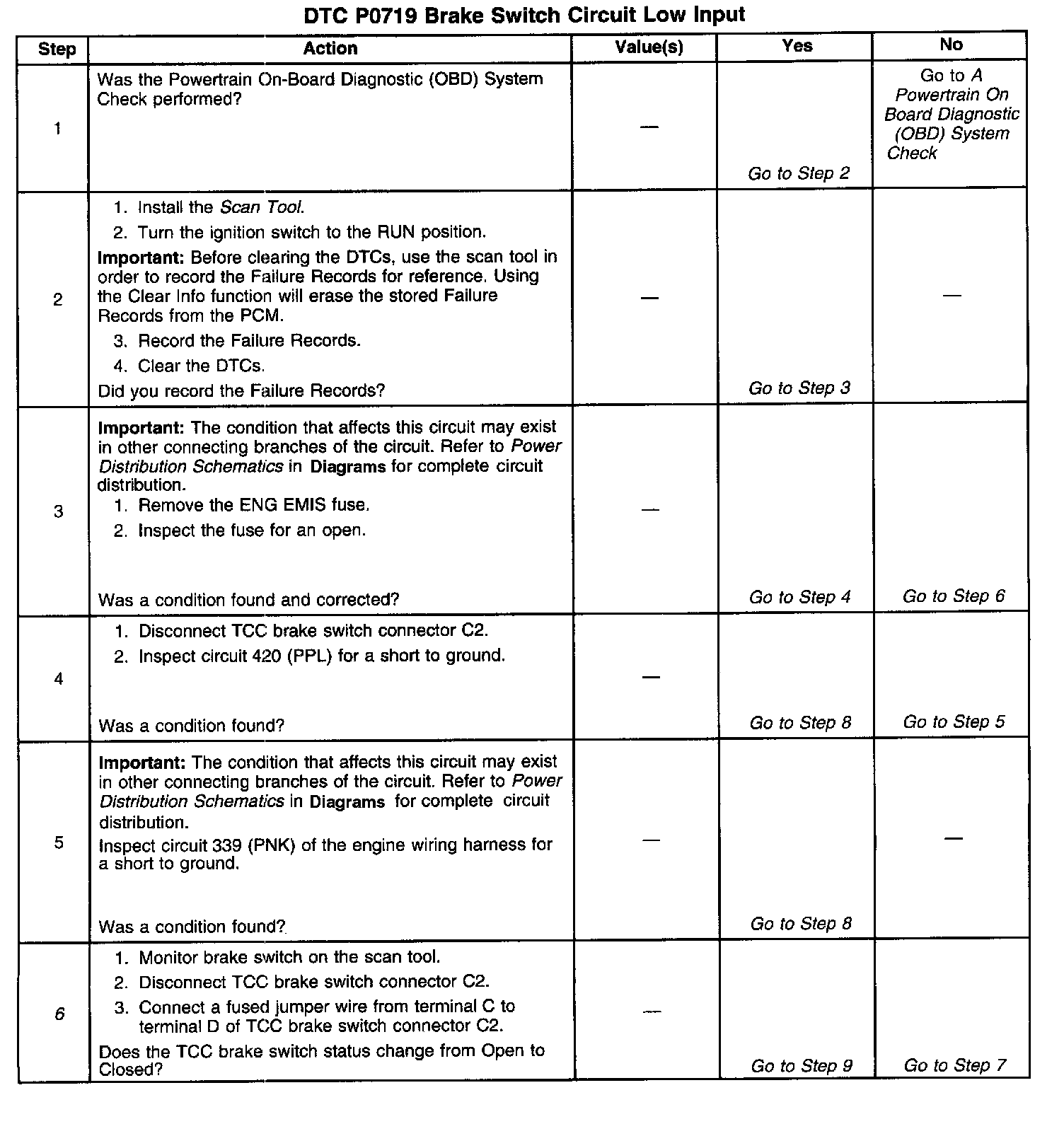 ^ Inspect the wiring at the PCM, the TCC brake switch connector and all other circuit connecting points for the following conditions:
