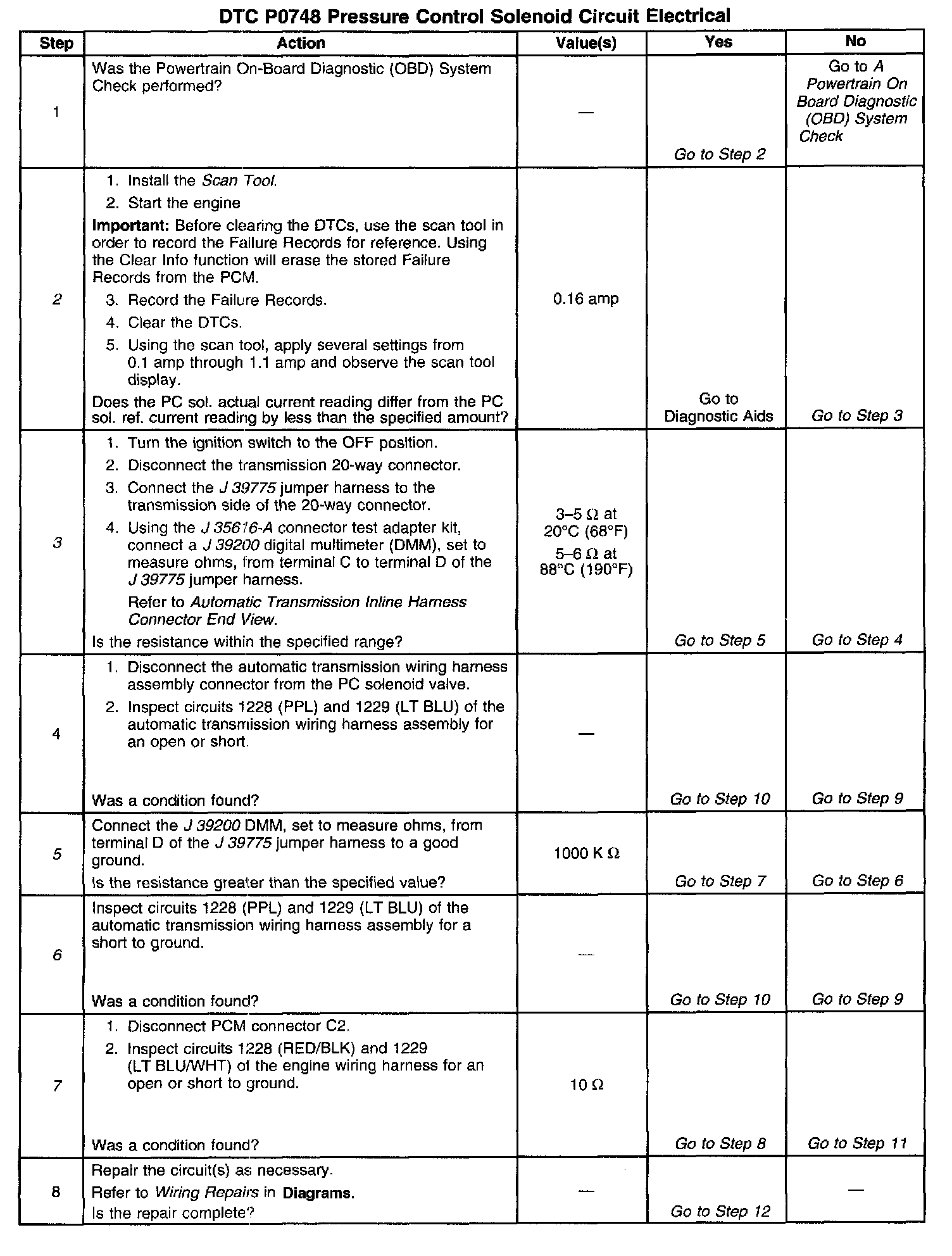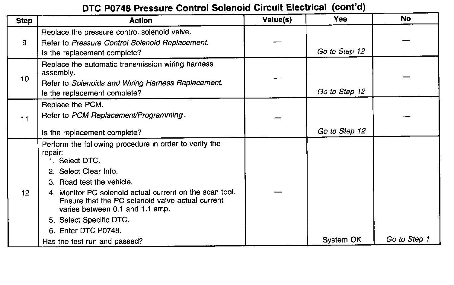 - If no circuit faults are detected during the 5 second retest period, then the PC solenoid valve is returned to normal operation and DTC P0748 diagnostic is passed.