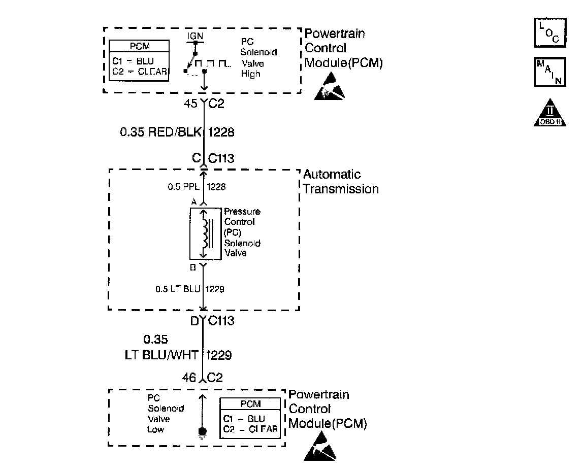 The pressure control (PC) solenoid valve regulates actuator feed fluid passing through the solenoid into torque signal pressure. The PCM uses a pulse width modulated signal in order to control the torque signal pressure. The PCM compares various inputs in order to determine the appropriate pressure for a given load. The PCM varies the current to the PC solenoid valve from 0.1-1.1 amp. An internal current monitor within the PCM provides feedback in order to determine actual PC solenoid valve current draw.
