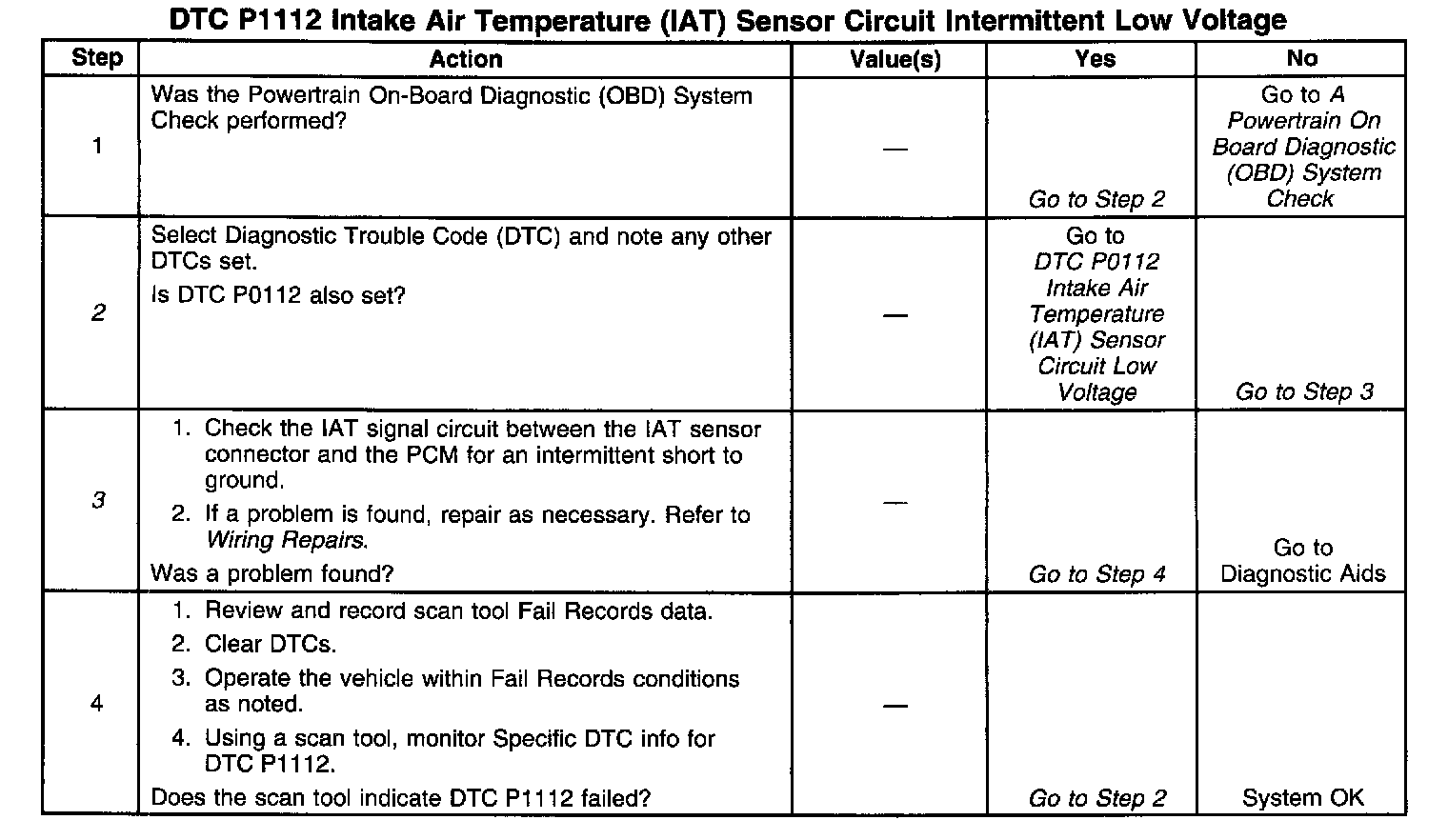 3. If DTC P1112 can be repeated only by duplicating the Fail Records conditions. The Temperature Vs Resistance Values table may be used to test the IAT sensor at various temperatures to evaluate the possibility of a shifted sensor that may be shorted above or below a certain temperature. If this is the case, replace the IAT sensor.