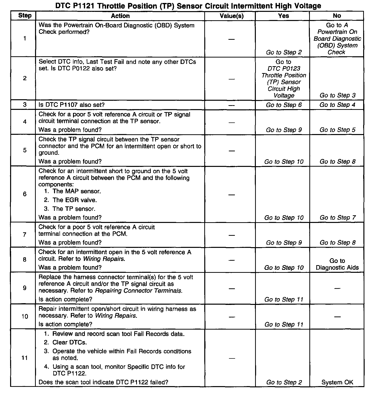 If DTC P1121 cannot be duplicated, reviewing the Fail Records vehicle mileage since the diagnostic test last failed may help determine how often the condition that caused the DTC to be set occurs. This may assist in diagnosing the condition.