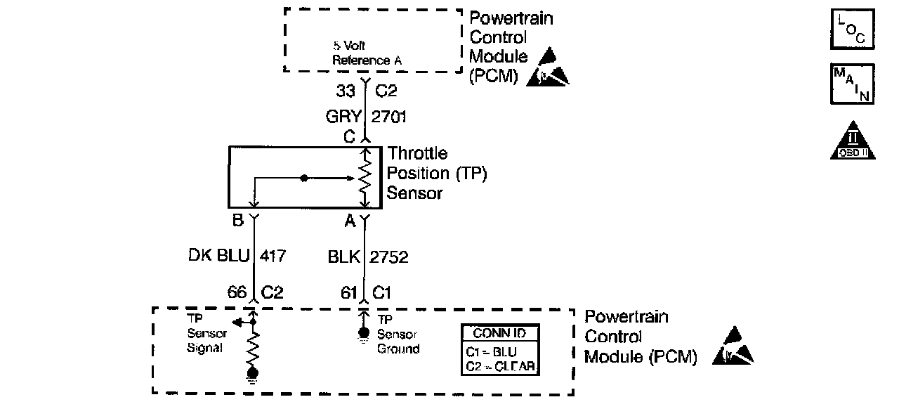 The Throttle Position (TP) sensor circuit provides a voltage signal that changes relative to throttle blade angle. The signal voltage will vary from 1 volt at closed throttle to 4.8 volts at Wide Open Throttle (WOT).