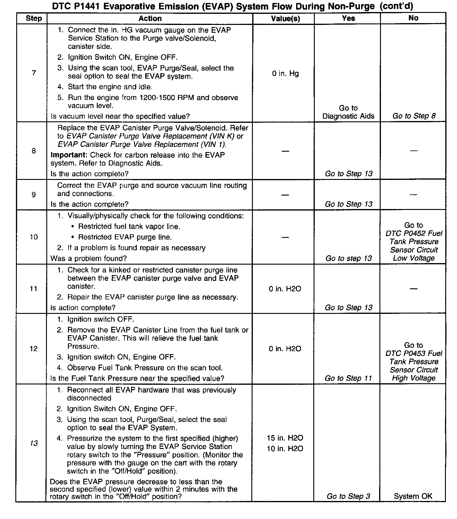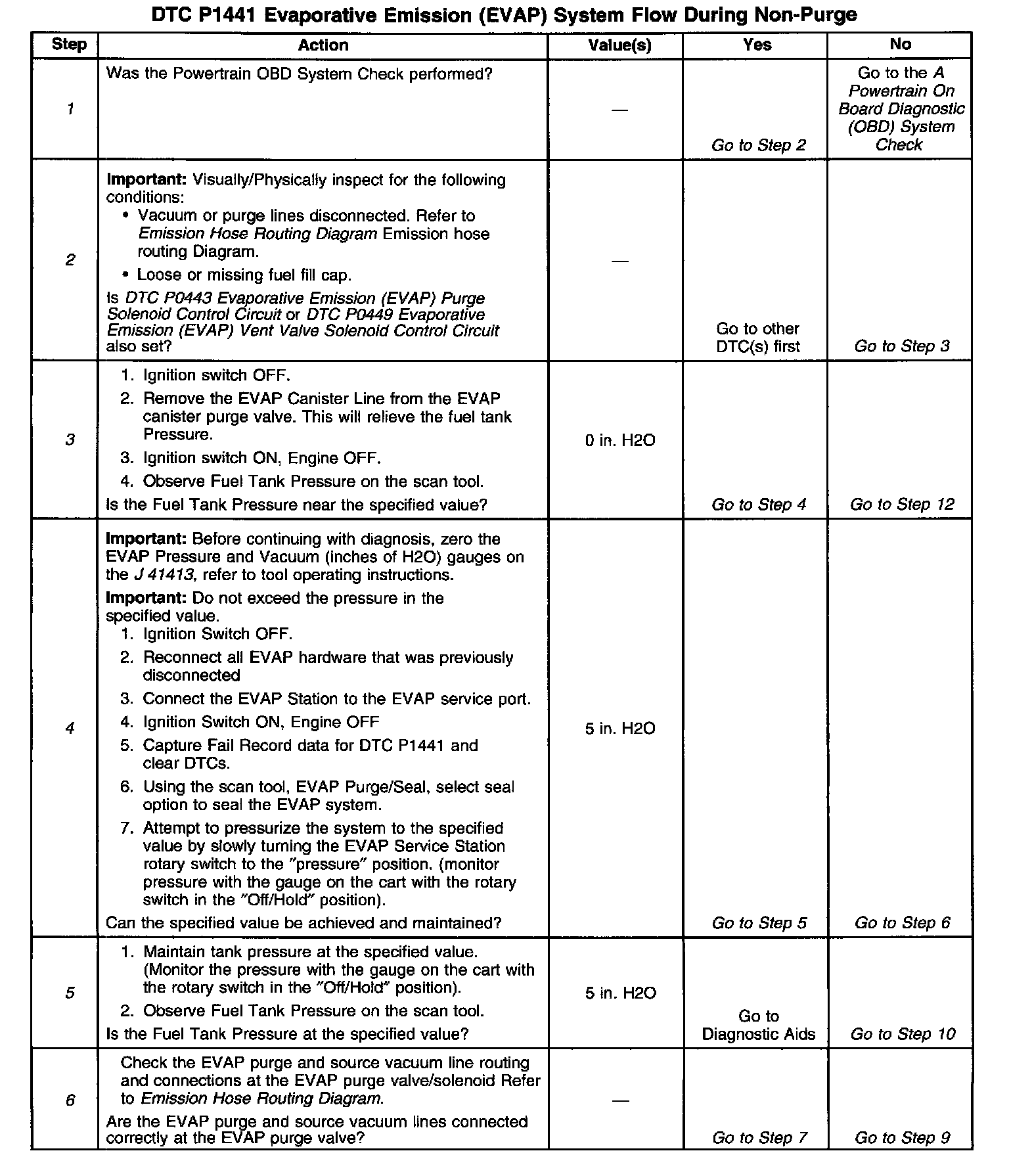^ If the harness appears to be OK, connect the J 41413 to the EVAP service port, pressurize the EVAP system to 10 in. H2O and observe the Fuel Tank Pressure display on the scan tool while moving connectors and wiring harnesses related to the EVAP purge valve. A sudden change in the display will indicate the location of the malfunction.