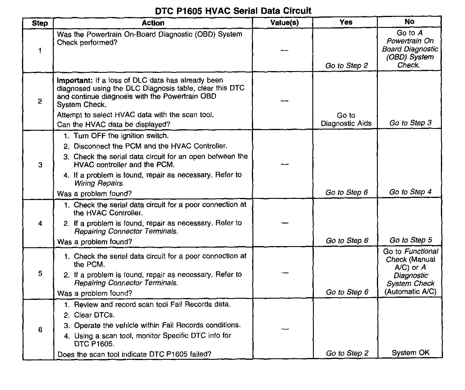 The PCM uses the serial data circuit to communicate with various other devices and systems in the vehicle. The PCM ensures that communication remains established by monitoring the serial data circuit for state of health messages from the other devices using the circuit. If the PCM detects a loss of the state of health serial data message from the HVAC Controller, DTC P1605 will be set.