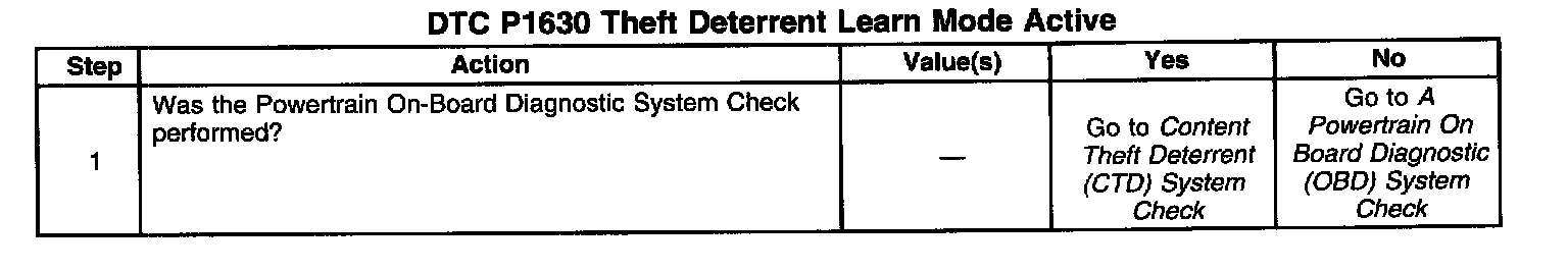 The Vehicle Theft Deterrent system (VTD) is incorporated within the Body Control Module (BCM). If the BCM has been replaced, the password must be relearned using approved Techline diagnostic equipment. If the PCM is replaced, the replacement PCM should learn the password within a few seconds after the ignition is turned ON. DTC P1630 is an information code indicating that the PCM is ready to learn the VTD password. The engine will start and continue to run with DTC P1630 set. Refer to Content Theft Deterrent (CTD) Circuit Description and Vehicle Theft Deterrent (VTD) Operation for further information regarding the VTD system.
