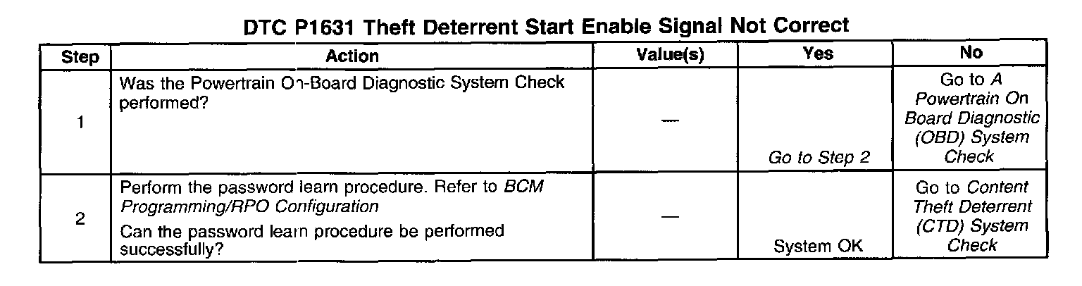 The PCM controls fuel injector and starter operation based on a vehicle theft deterrent (VTD) password from the vehicle Body Control Module (BCM). When the ignition is first turned ON, the BCM sends a programmed VTD password to the PCM. The PCM acknowledges the password and responds to the BCM that normal fuel injector and starter operation will continue. If the PCM detects an incorrect password (VTD system failure or attempted vehicle theft), DTC P1631 will set. The engine will not start or crank as long as the condition is present.