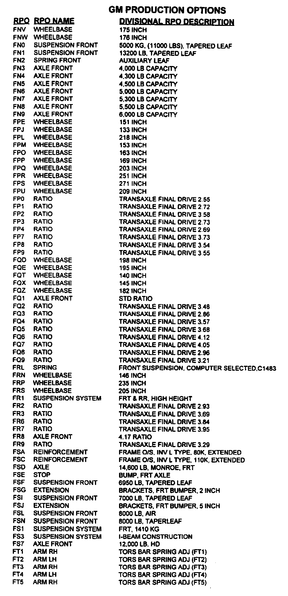 RPO Code List