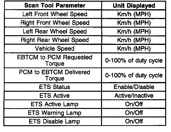 ^ ETS Status-This parameter indicates the state of the ETS based on if the operator has disabled ETS by pressing the Traction Control switch, or if the ETS is disabled because of a malfunction.