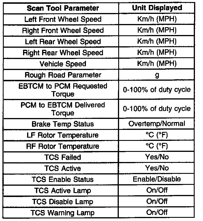 ^ TCS Enable Status-This parameter indicates the state of the TCS based on if the operator has disabled TCS by pressing the Traction Control switch, or if the TCS is disabled because of a malfunction.