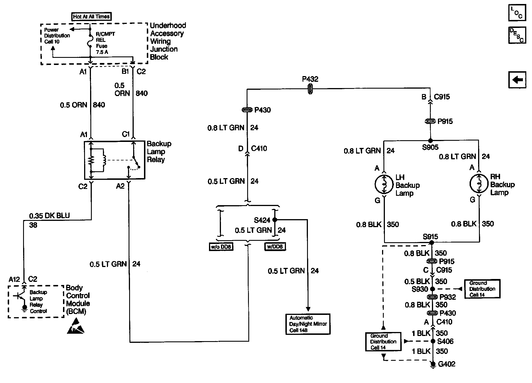 Backup Lights Schematics: Backup Lamp Relay, BCM, Backup Lamps: