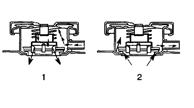 The pressure-type cap contains a blowoff (pressure) valve (2) and a vacuum (atmospheric) valve (1). A spring of pre-determined strength holds the pressure valve against the valve's seat. This spring protects the radiator by relieving any pressure that exceeds design limits. A spring holds the vacuum valve against the valve's seat which permits opening of the valve in order to relieve vacuum created in the system when the system cools. This prevents radiator collapse.