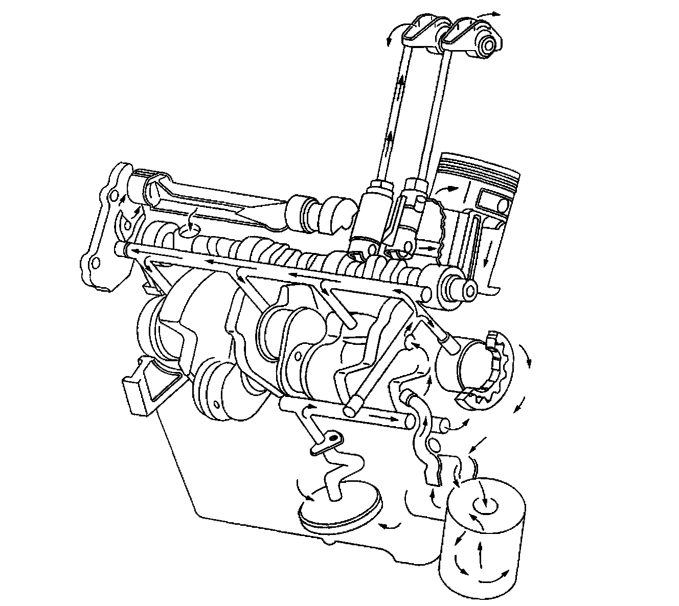 Oil is transferred from the crankshaft bearings to the connecting rod bearings through holes drilled in the crankshaft. Pistons, piston pins, and cylinder walls are lubricated by oil splash from the crankshaft and connecting rods.