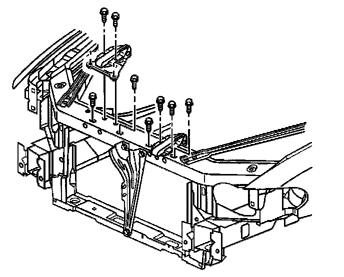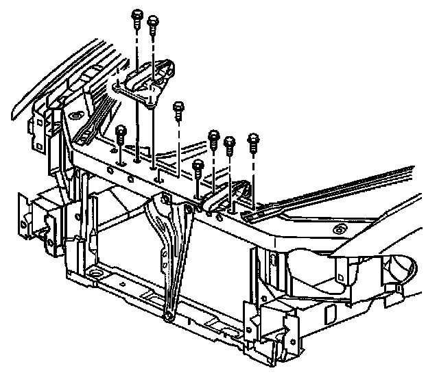 Removal Procedure1. Remove the engine mount strut(s) from the engine mount strut bracket(s) at the upper radiator support. Refer to Engine Mount Strut Replacement (Left) and/or Engine Mount Strut Replacement (Right).