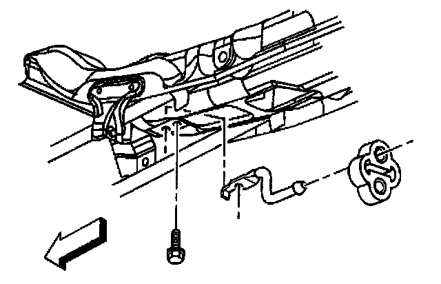 ^ The exhaust pipe where it meets the right side of the vehicle is supported by the exhaust muffler front hanger bracket and an exhaust pipe hanger bracket insulator.