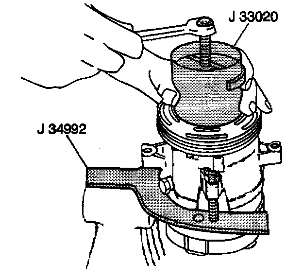 6. Hold the J 33020 in place. Tighten the puller screw against the puller guide in order to remove the puller rotor and bearing assembly.