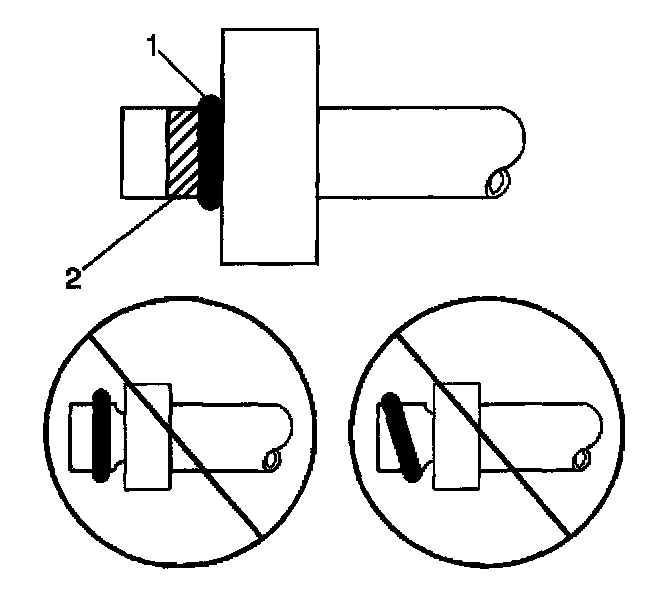 Lightly lubricate the new O-ring seal (1) with mineral base 525 viscosity refrigerant oil. Leave a light coating of the refrigerant oil to remain on the A/C refrigerant hose in the area indicated (2) ONLY.