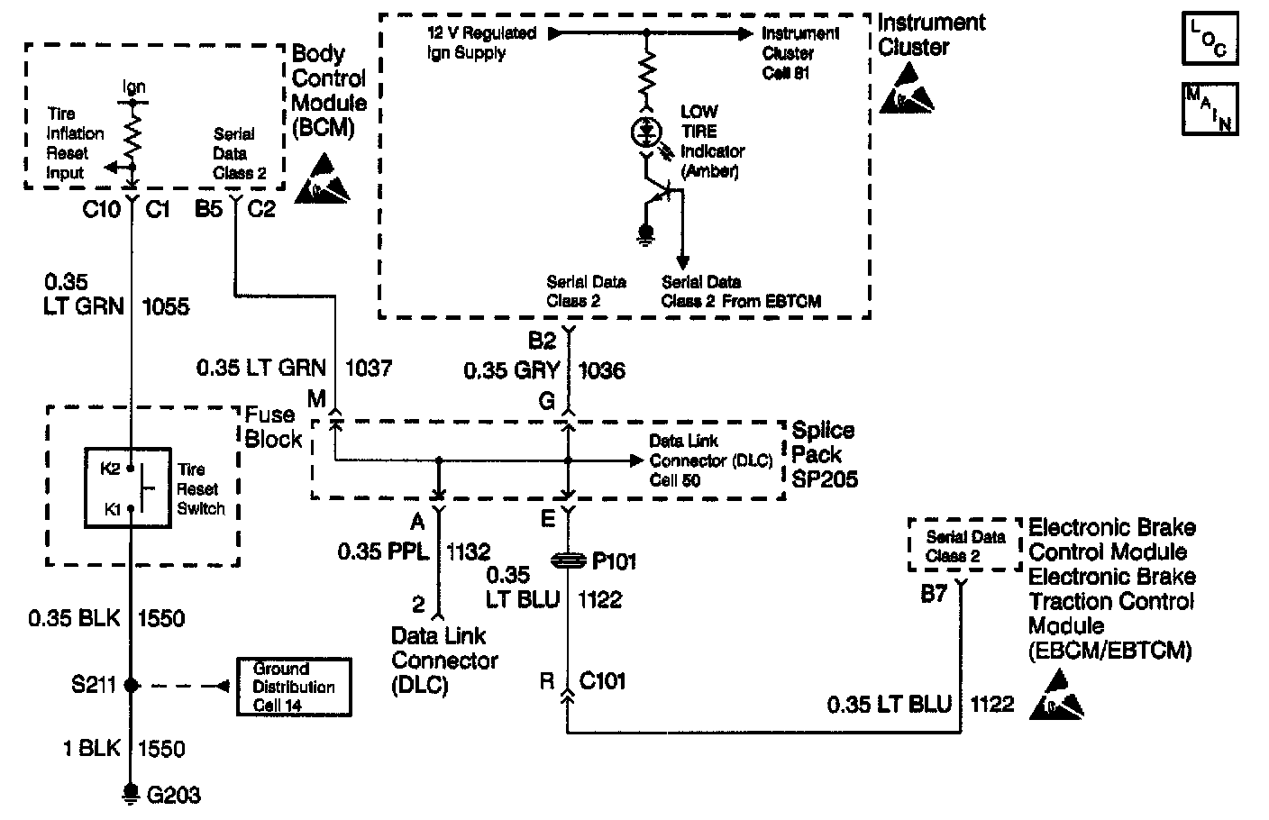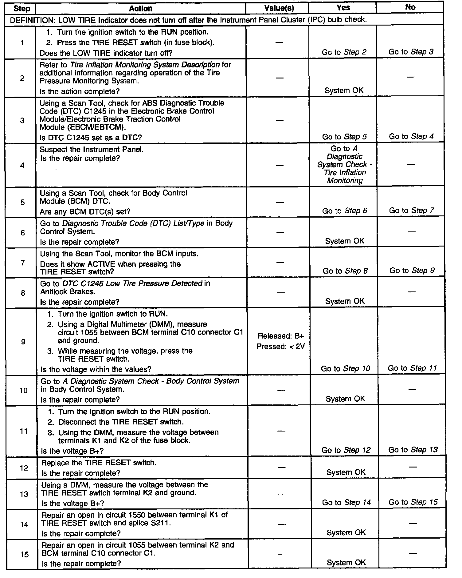 The Instrument Panel Cluster (IPC) turns the LOW TIRE Indicator ON for approximately 3 seconds when the ignition switch is turned to the RUN position during the IPC bulb check. If the EBCM/EBTCM sets a Diagnostic Trouble Code (DTC), the EBCM/EBTCM sends a class 2 message to the IPC commanding the LOW TIRE Indicator ON.