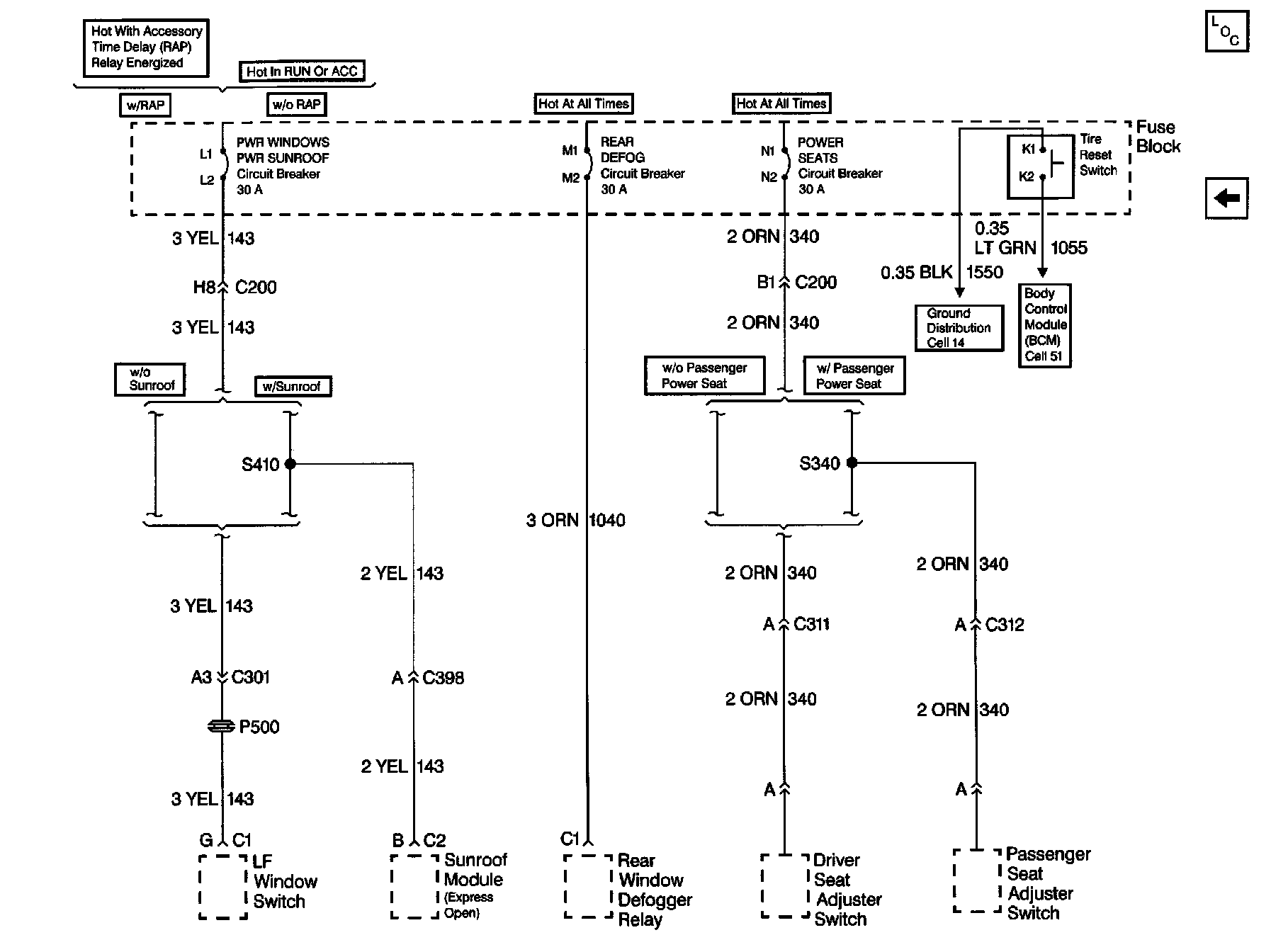 Fuse Block Details Schematics: PWR Windows, PWR Sunroof, Rear DEFOG And Power Seats Circuit Breakers: