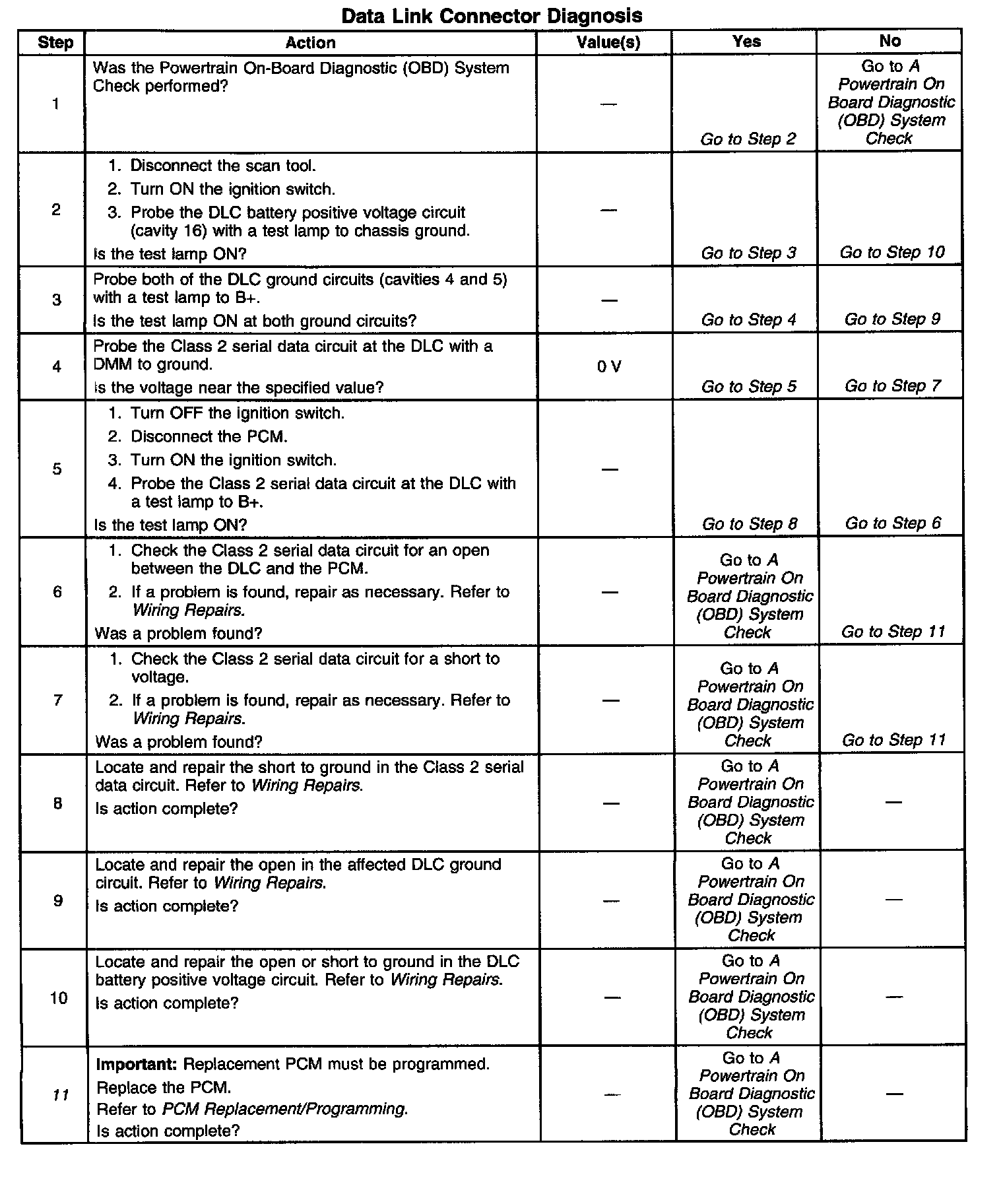 The Class 2 serial data circuit to the DLC allows bi-directional communication between the PCM and the scan tool. If communication between the scan tool and the PCM cannot be established, the procedure in the DLC Diagnosis table should be used to diagnose the condition.