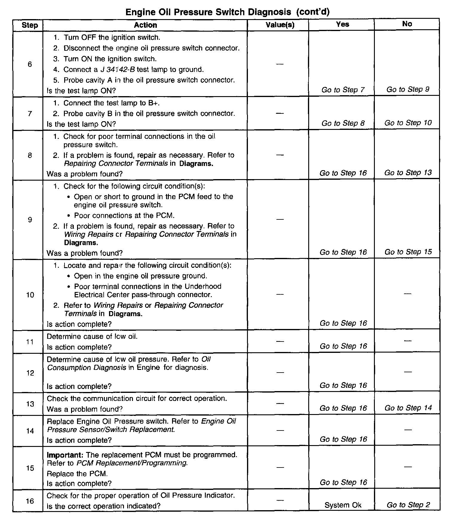 ^ Damaged harness. Inspect the wiring harness for damage. If the harness appears to be OK, disconnect the Engine Oil Pressure switch, turn the ignition ON and observe a voltmeter connected between the Engine Oil Pressure switch connector terminals while moving wiring harnesses related to the Engine Oil Pressure Switch circuit. A change in voltage will indicate the location of the fault.