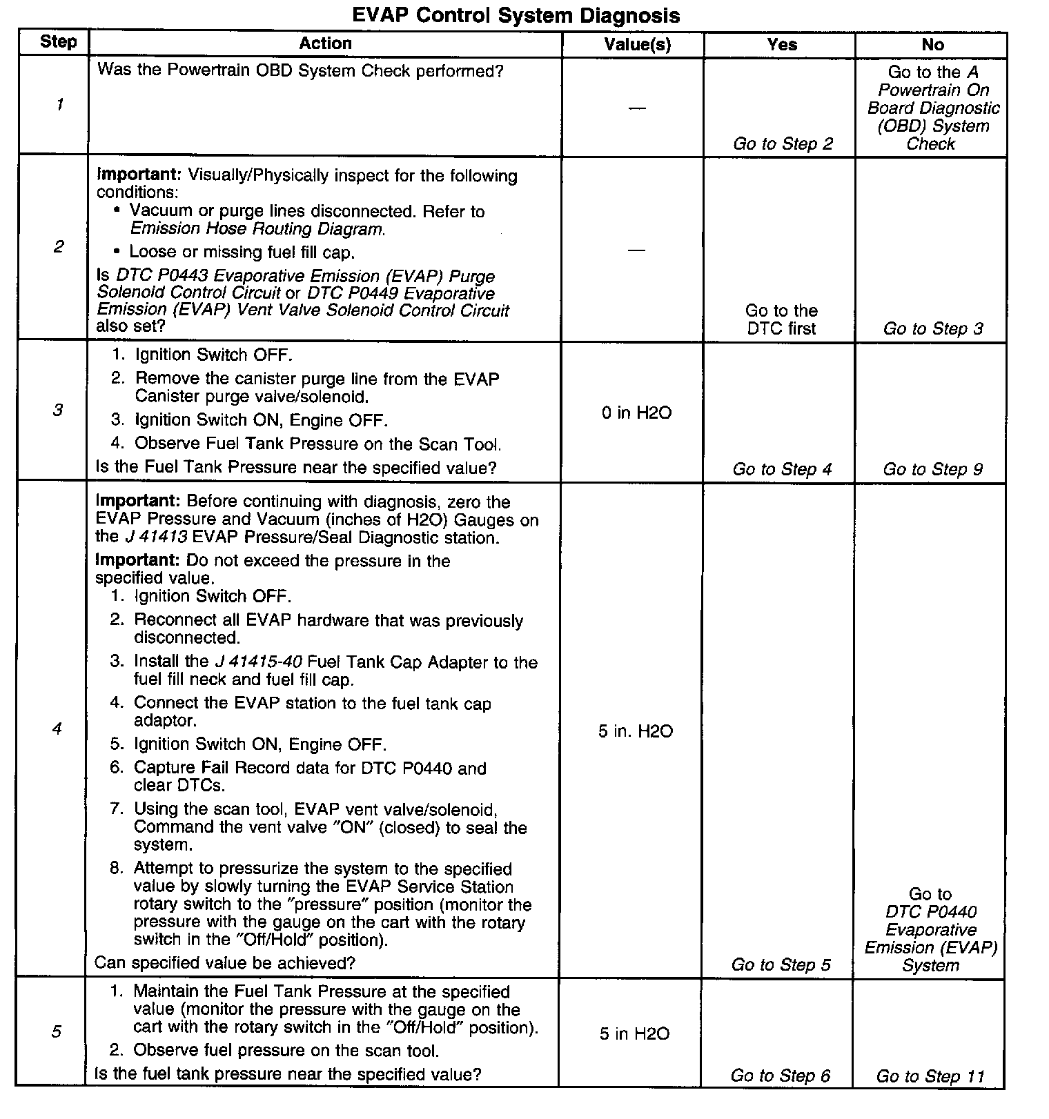 5. Verifies that the fuel tank pressure sensor accurately reacts to EVAP system pressure changes. The [1][2]EVAP station is pressurizing a sensor that normally reads vacuum. The tech II reads high pressure at 0 volts and high vacuum at 5 volts. the Tech II can only read a max pressure of 6.0 inches of H2O (0 Volts). However the EVAP Service station can pressurize the system to much higher pressures. The Scan Tool value should be within ±0.5 of the specified value.