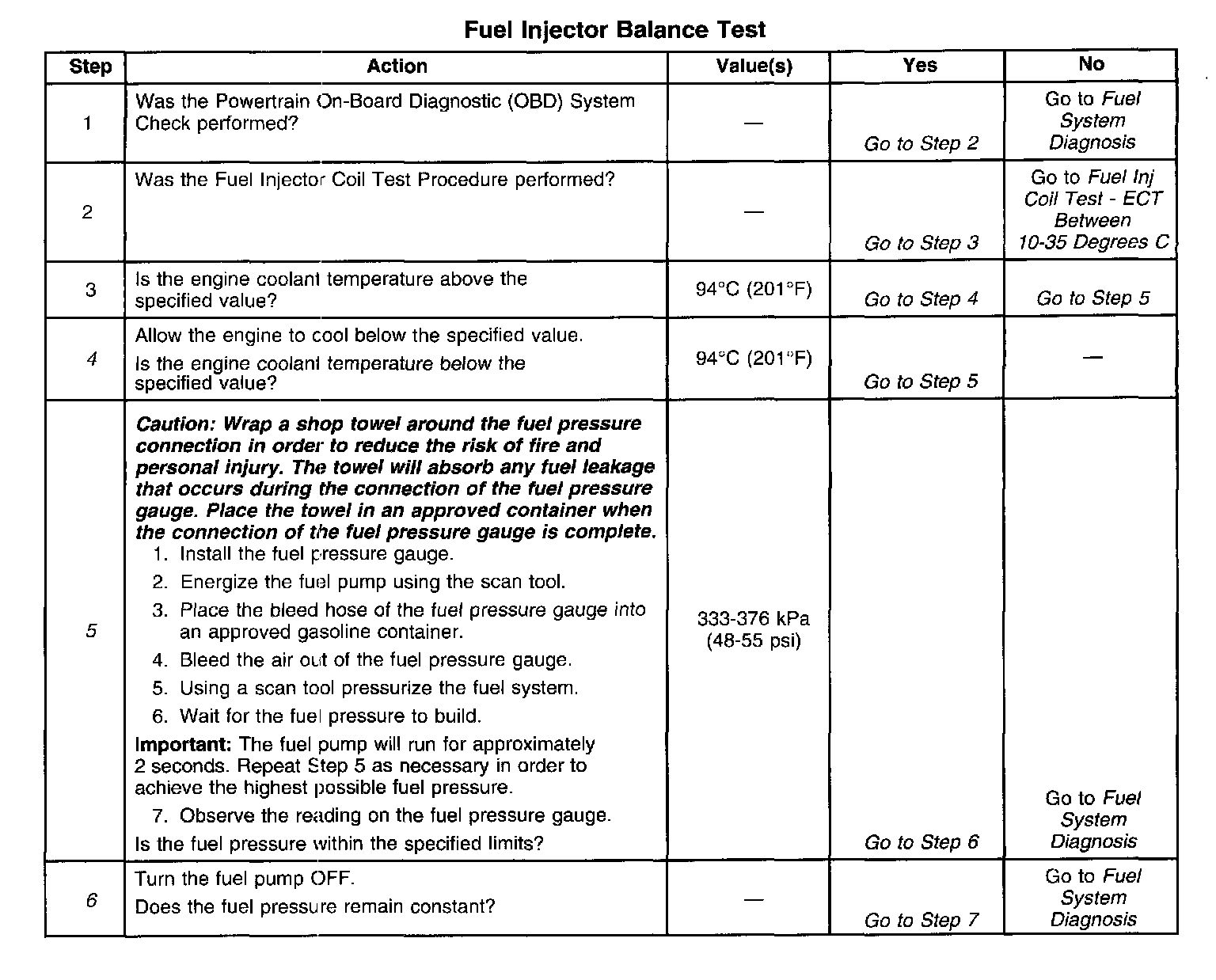 6. The fuel pressure should reach a steady value. If the fuel pressure does not reach a steady value, refer to Fuel System Diagnosis. Component Tests and General Diagnostics