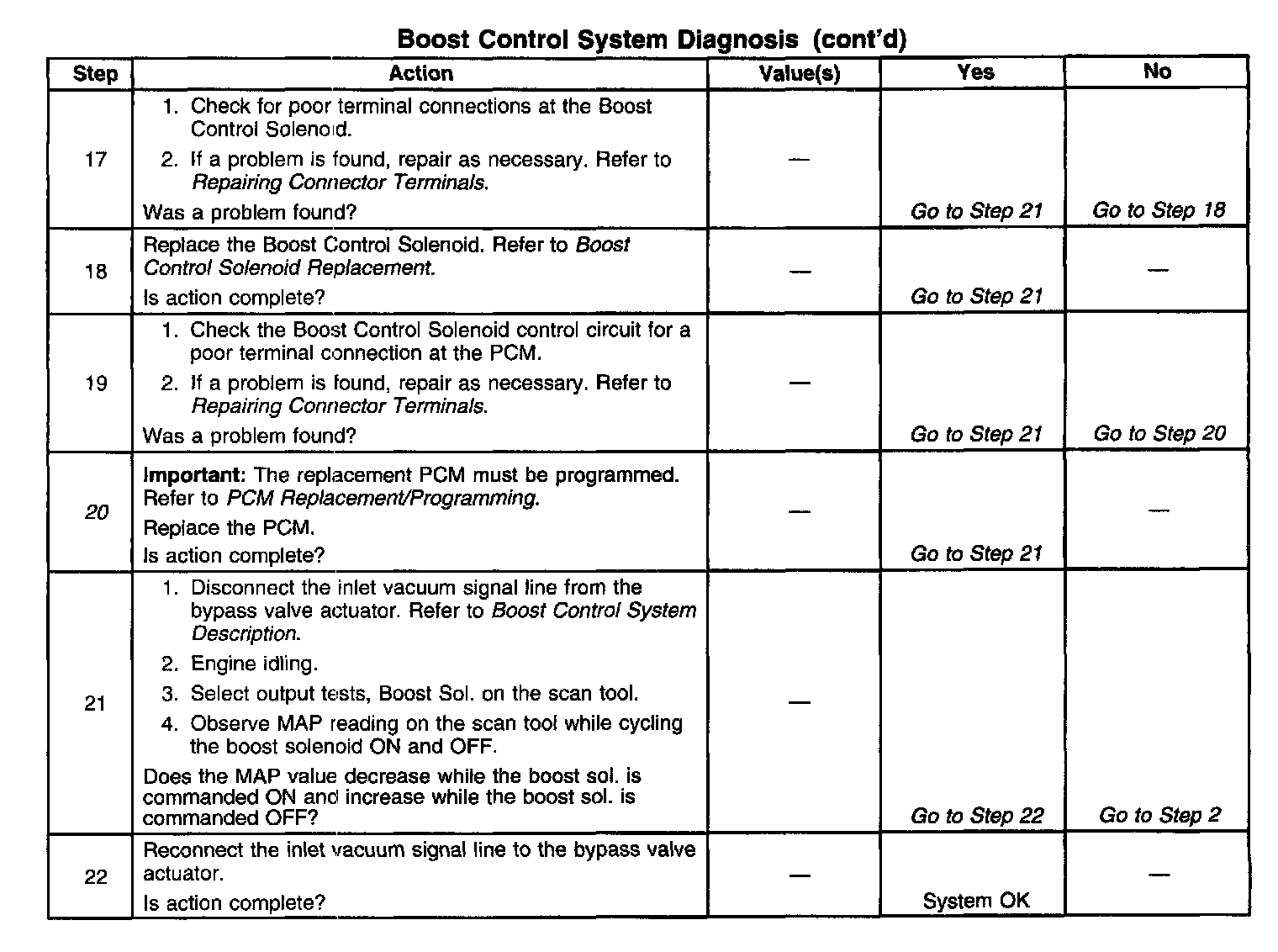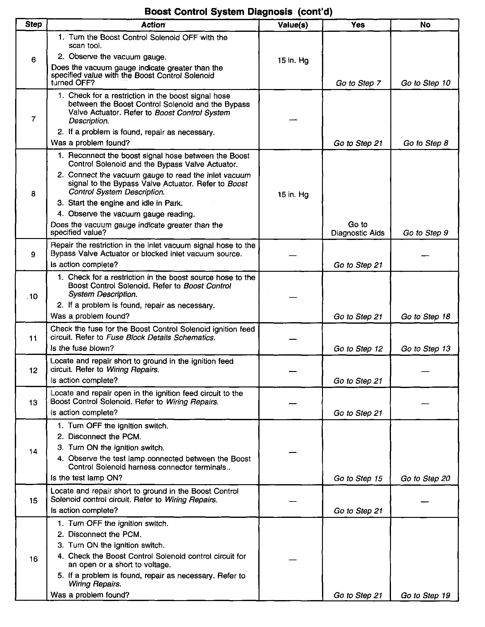 If the Boost Control System Check has been performed and no electrical or vacuum related fault is noted, check for the following conditions: