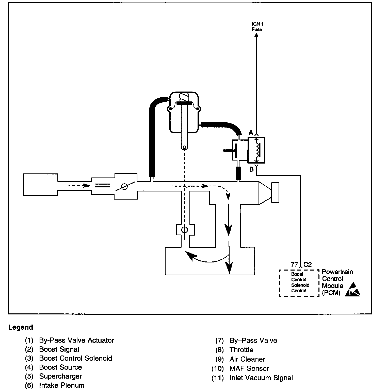 Under most conditions, the PCM commands the boost control solenoid to operate at a 100% duty cycle (ON) to allow full boost pressure upon demand. However, if reverse gear is selected or the PCM detects rapid deceleration or engine load is extremely high, reduced boost pressure is desired. Under these conditions, the PCM commands the boost control solenoid to operate at a 0% duty cycle (OFF), which opens the bypass valve. With the Bypass valve open, boost pressure is reduced by recirculating intake air back through the supercharger inlet.