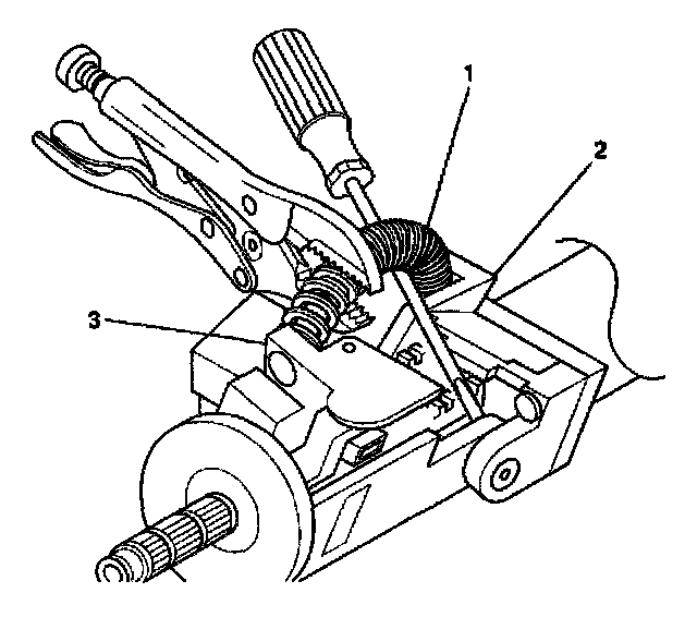 3. Remove the tilt spring (1) from the steering column support assembly (2) and from the steering column tilt head assembly (3) by using the following procedure: