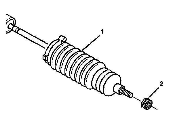 2. Prior to rack and pinion boot installation, apply grease to the inner tie rod assembly (2) and the rack and pinion gear assembly (1).