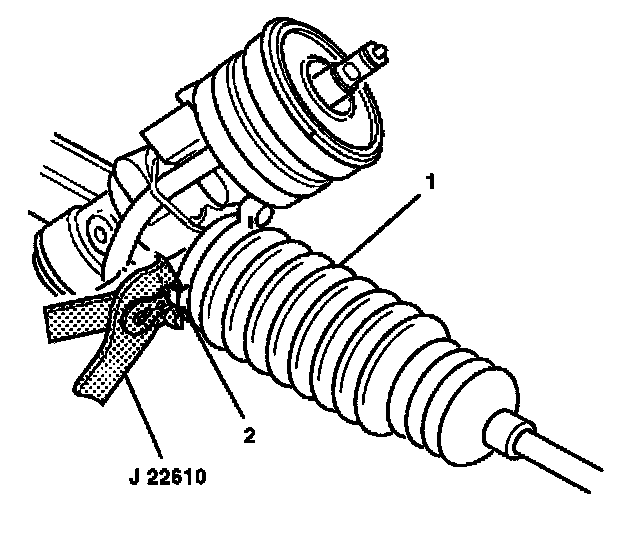 7. Install the boot clamp (2) on the rack and pinion boot (1) with J 22610.