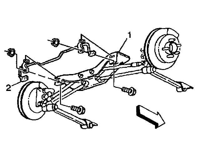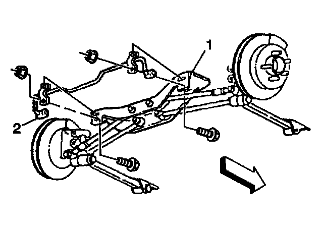 6. Remove the stabilizer shaft (2) from the rear suspension support (1).