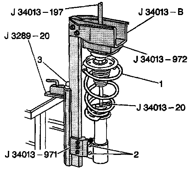 2. Install the strut (1) in the J 34013-B Using adapters J 34013-971 J-34013-972 and the J 3289-20.