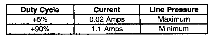 TCC duty cycle for ECCC equipped vehicles is 22 percent for minimum apply pressure and 43 percent for maximum apply pressure. The TCC PWM solenoid valve will typically be 40-60 percent at full apply. Your results may vary.