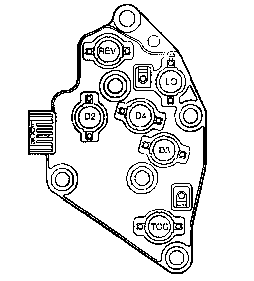 The automatic transmission Fluid pressure (TFP) manual valve position switch is attached to the valve body and consists of six fluid pressure switches. Three of the fluid pressure switches D4, Low, and Reverse) are normally open, while the other three (D3, D2 and TCC Release) are normally closed. These six switches indicate the position of the manual valve. The PCM uses this information in order to control line pressure, TCC apply and release, and shift solenoid operation.