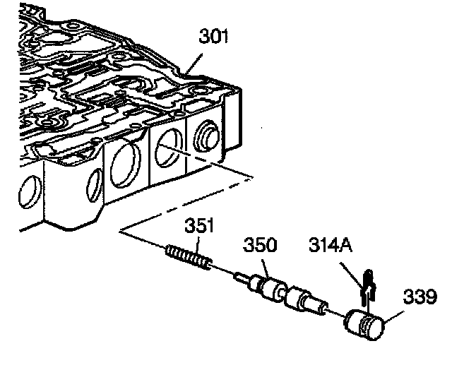 26. Remove the 1-2 accumulator valve bore plug (339), 1-2 accumulator valve (350) and 1-2 accumulator valve spring (351) from the control valve body (301).
