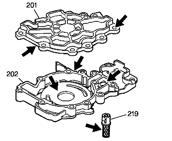 4. Inspect the oil pump cover (201) for cracks, wear or gouges from the pump vanes.