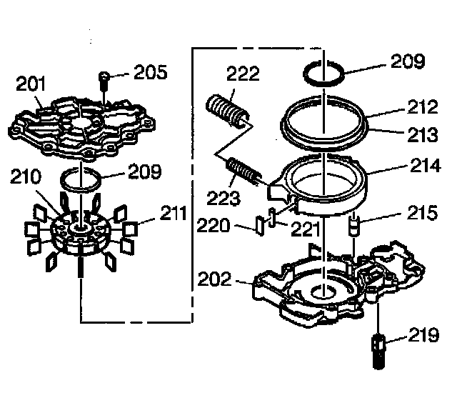 18. Install the pump vanes (211) into the rotor (210). The pump vanes (211) must be flush with the top of the rotor (210).