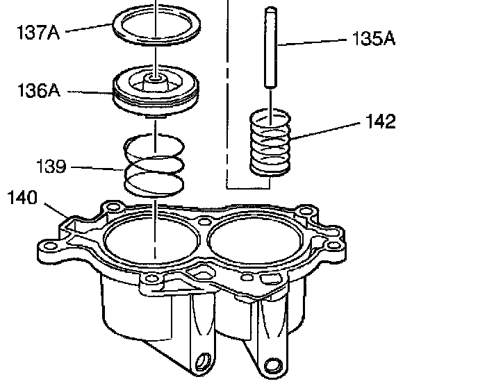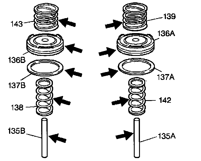 9. Install the 1-2 accumulator piston springs (139, 142) and the piston assembly (136A) into the accumulator housing (140).
