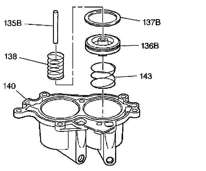 6. Install the 2-3 accumulator piston springs (138, 143) and piston assembly (136B) into the accumulator housing (140).