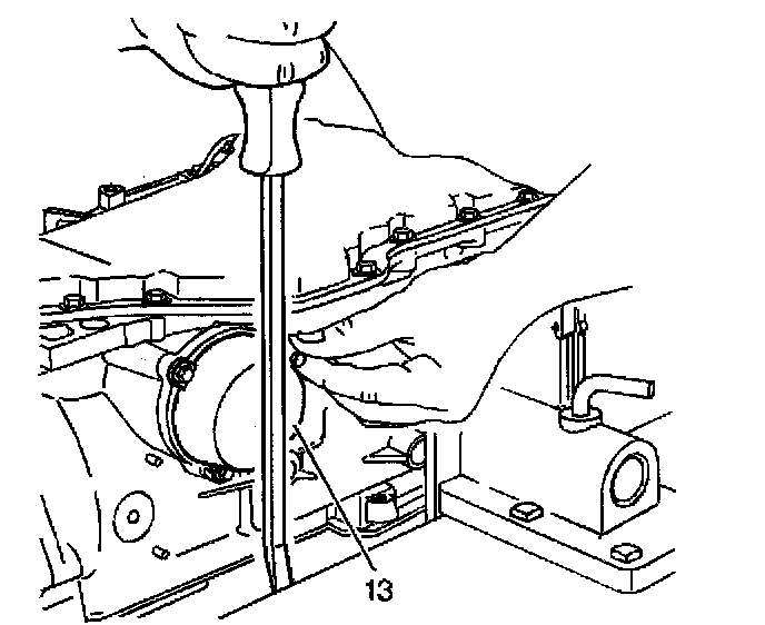 10. Using a long screwdriver, pry against the work bench to compress the forward band servo assembly (13).
