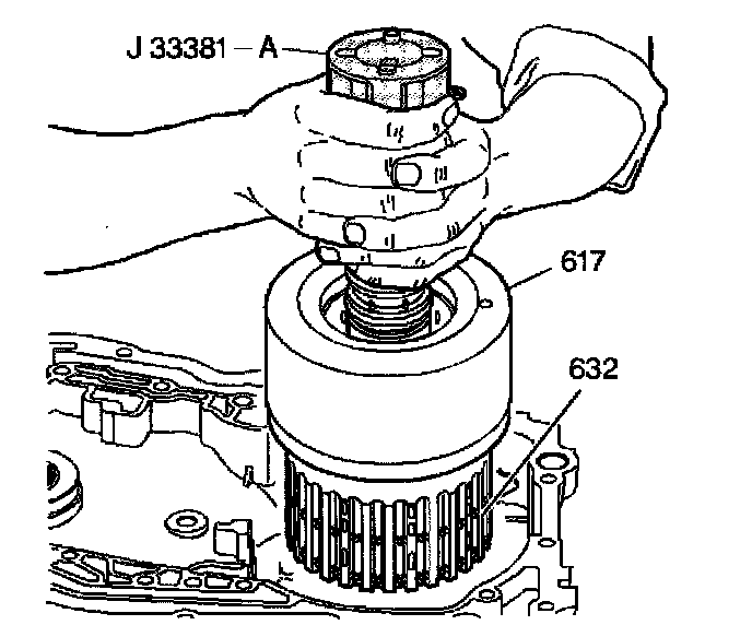 2. Install J 33381-A into the second clutch housing assembly (617).