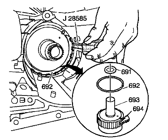 2. Use J 28585 or a large screwdriver in order to remove the differential carrier internal gear snap ring (692).