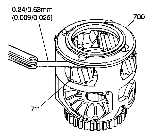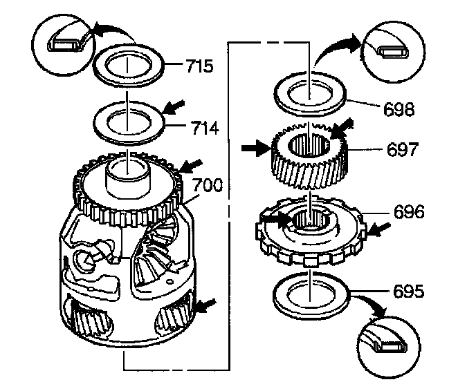 ^ Damaged internal gear/parking gear thrust bearing (695), differential carrier/sun gear thrust bearing (698) or differential carrier/case thrust bearing (715)